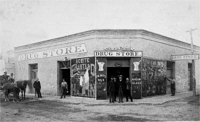 On the back of the original photo is written: "View of a druggist store together with the doctor who cured me of typhoid fever". From Alfred Carter Attfield, while working on the railways in Texas.