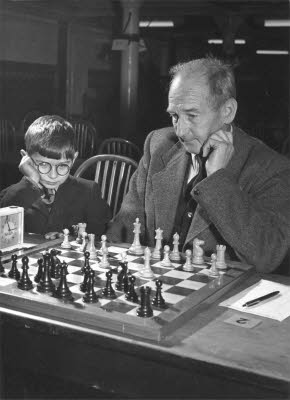 This photo appeared in the London Evening Standard, Saturday Dec 1, 1956, with the following caption: "Seven year old John Attfield watches closely as his father, Alfred Attfield, contemplates his next move during a game at the National Chess Centre, Bishopsgate. Mr. Attfield, of Camberwell, is captain of the Kent chess team."