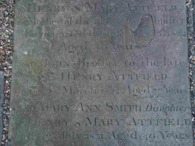 Part of a well-preserved Attfield gravestone in St Peters churchyard, Chertsey, Surrey, featuring the family of Henry Attfield (1746-1821).
